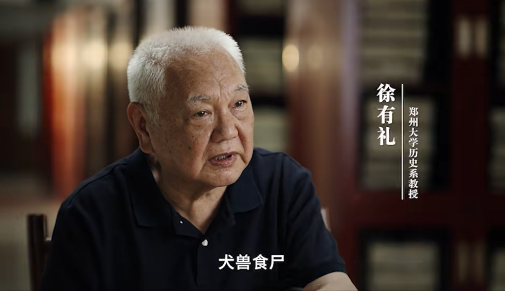 徐有礼教授:河南灾区饿殍载道,当年饿死了300万(人),什么东西都吃完了,沿途乞讨,树根、树皮、树叶,包括鸟粪,最后就是这个观音土,他就果腹了,犬兽食尸,就是狗啃尸体。